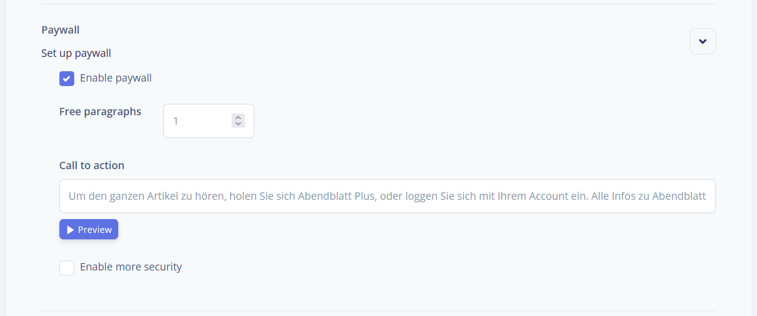 A variety of top text-to-speech providers on one platform. Easy implementation with a single line of code and instant provider switching. Paywall integration and audio monetization work immediately – without additional IT effort.